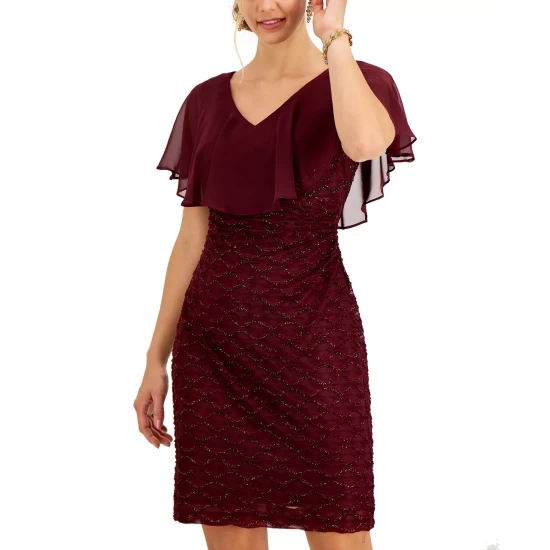 Topped with a soft overlay for an elegant finish, this fitted sheath dress from Connected shimmers with every step.
