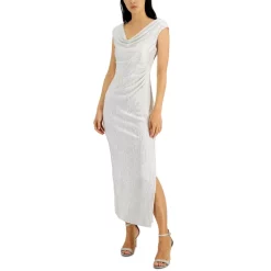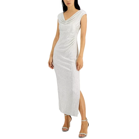 Connected’s petite gown is an extravagant pick designed with a draped cowlneck and textured metallic finish.