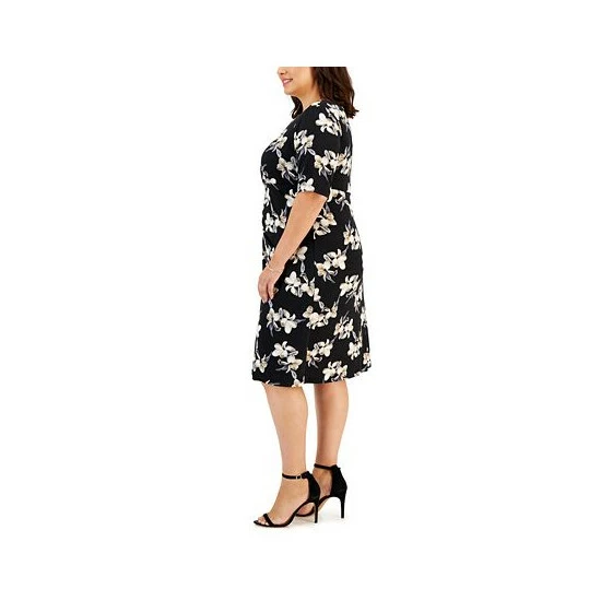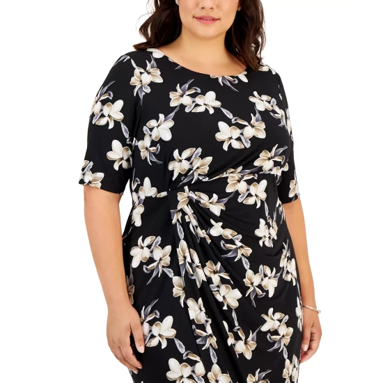 A modern drape lends sleek figure flattering definition to this plus size dress from Connected, a floral print design for any occasion.