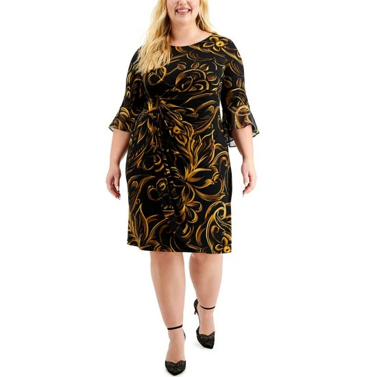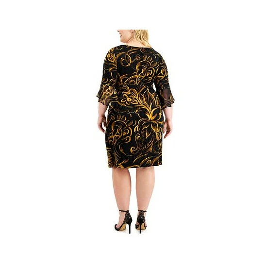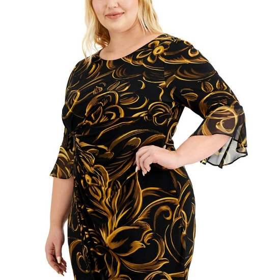 A rich palette of swirling printed style paints this Connected plus size pleated-side sheath with a picture-perfect party look.