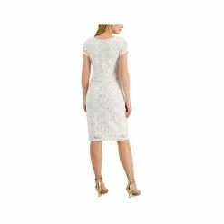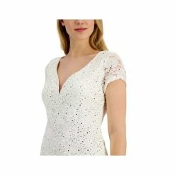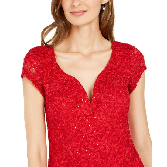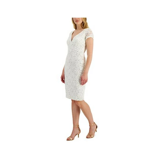 Short cap sleeves flow gracefully into a flattering neckline on this sophisticated cocktail dress covered in sequined lace from Connected.