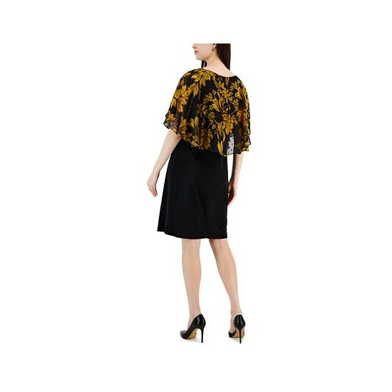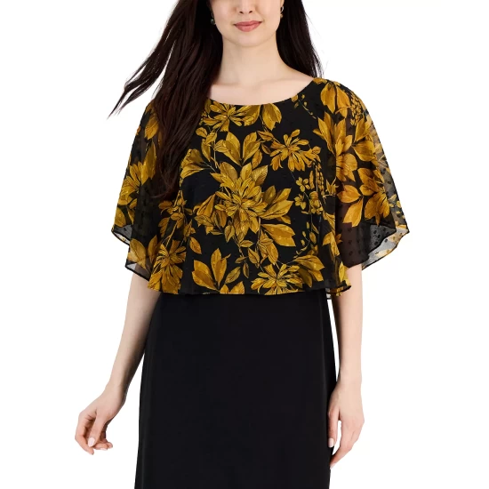 A floral print cape overlay lends feminine flair to this women’s dress from Connected. Fashioned in a jersey-knit design for a figure flattering finish.