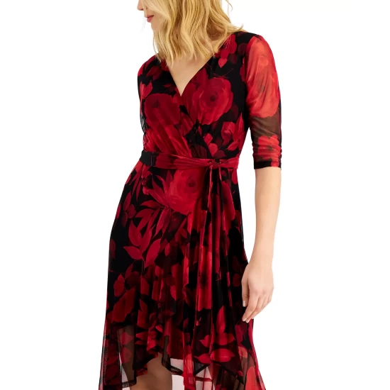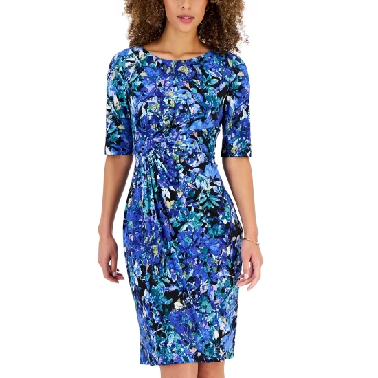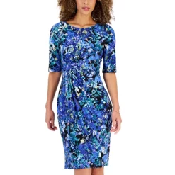 Flourishing florals adorn this chic sheath dress by Connected, the perfect party dress, this piece is finished with finessed flared sleeves and a form-flattering ruched waist.