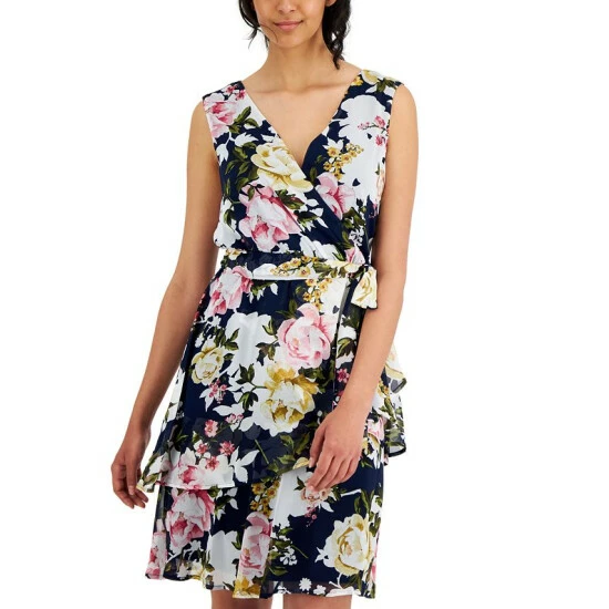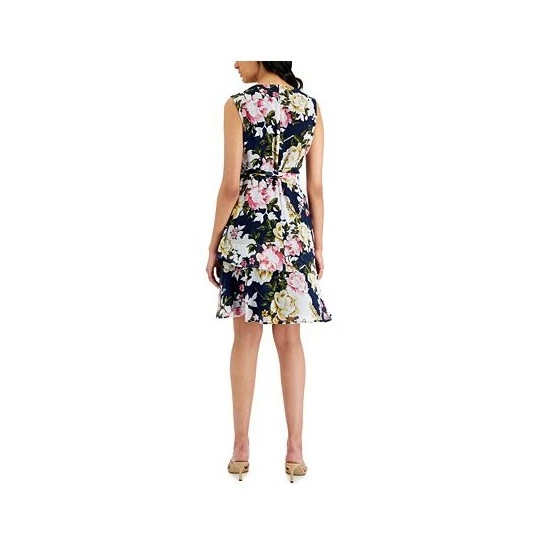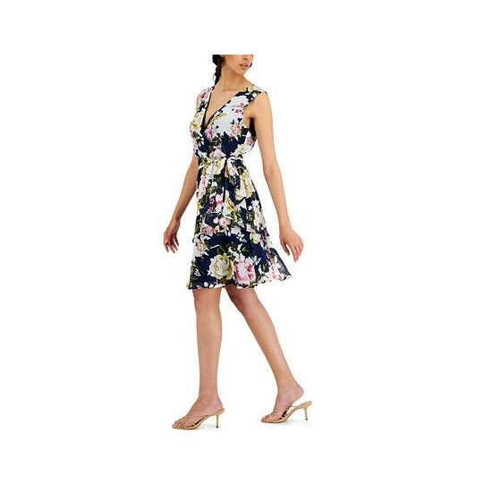 Charm your way across the room in this floral-print dress from Connected, finished with a tie belt at the waist for added definition.
