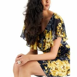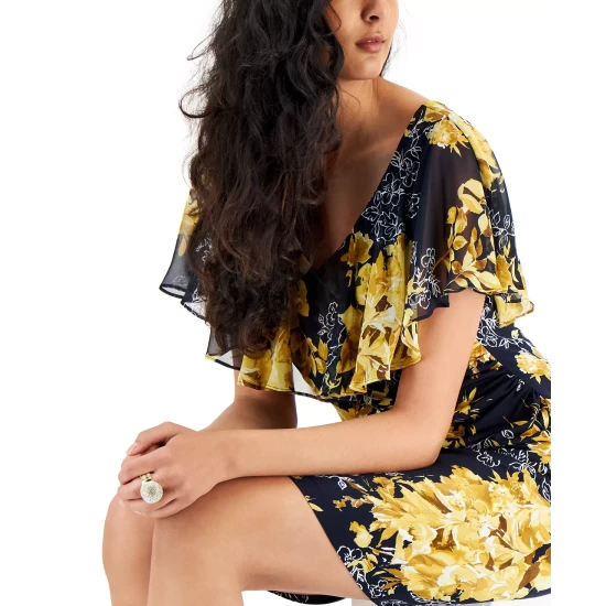 - Polyester/spandex; cape flounce & partial lining: polyester