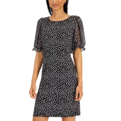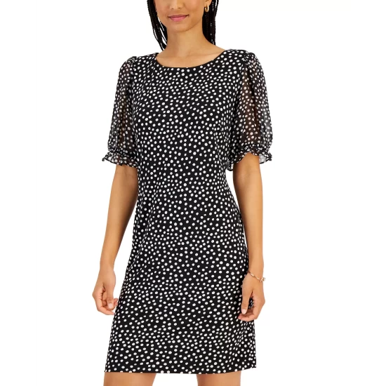 Dotted throughout, light and airy puff sleeves frame the soft jersey-knit of this Connected sheath that’s ready to be spotted at your next party.