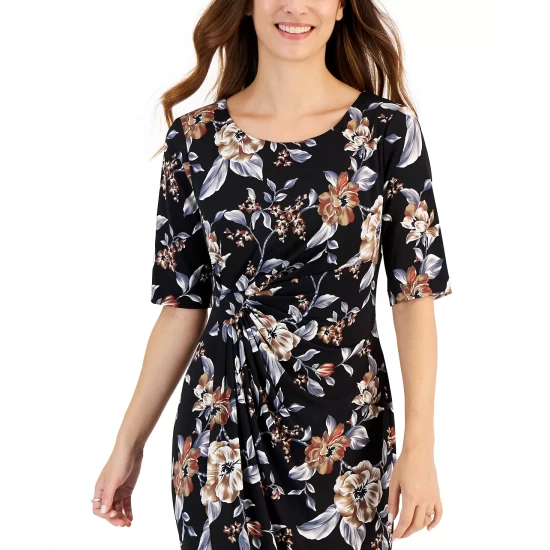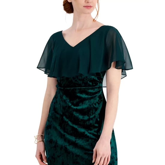 - Round neckline; Faux-wrap gown silhouette