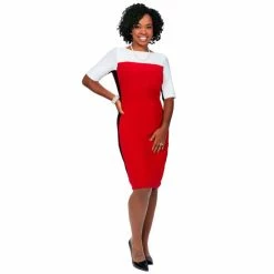 Pops of colorblocked detailing highlight the sides of a sleek, tailored look wit this soft, stretchy jersey sheath dress from Kasper.