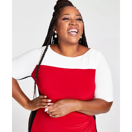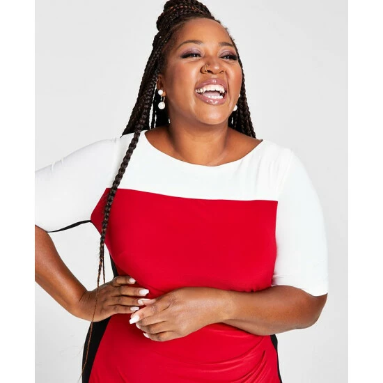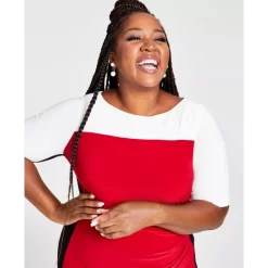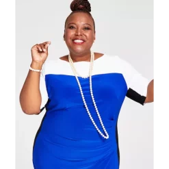 A trio of tones stylishly align in Kasper’s Chaplin colorblocked plus size sheath with flattering elbow-length sleeves. In it, you’ll be dressed for desk-to-dinner success.
