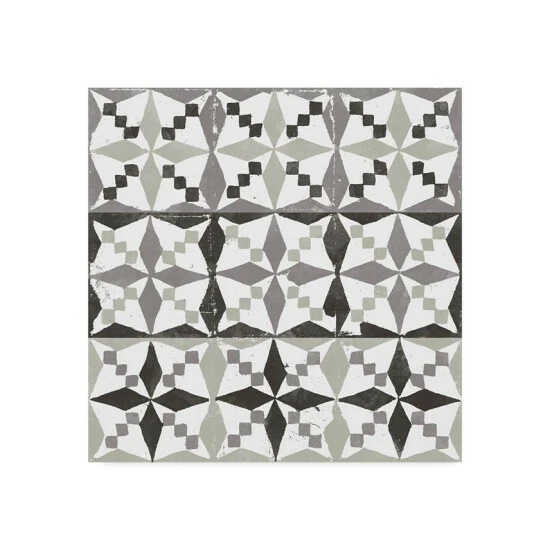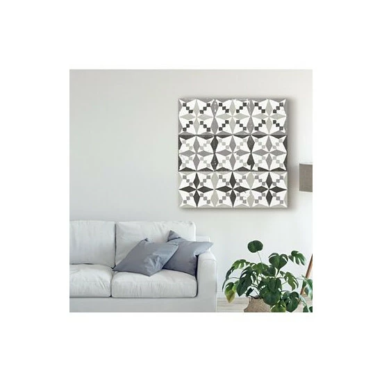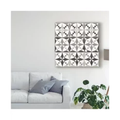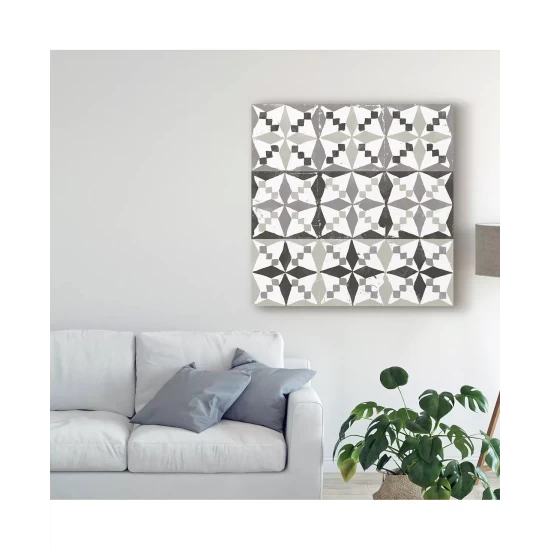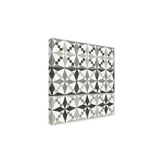 This ready to hang, gallery-wrapped art piece features gray and black tiles filling a pattern. Gallery-wrap is a method of wrapping an artist’s canvas around a hidden, wooden frame allowing for a frameless presentation.