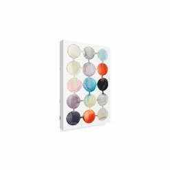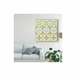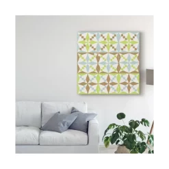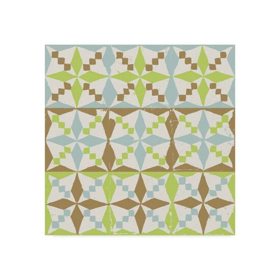 This ready to hang, gallery-wrapped art piece features blue and green tiles filling a pattern. Gallery-wrap is a method of wrapping an artist’s canvas around a hidden, wooden frame allowing for a frameless presentation.