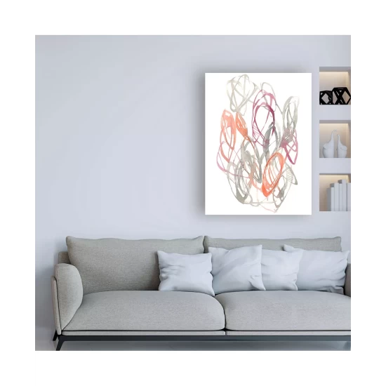 This ready to hang, gallery-wrapped art piece features gray and pink line art of a plant over a white background. Gallery-wrap is a method of wrapping an artist’s canvas around a hidden, wooden frame allowing for a frameless presentation.