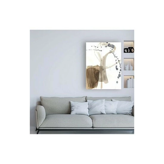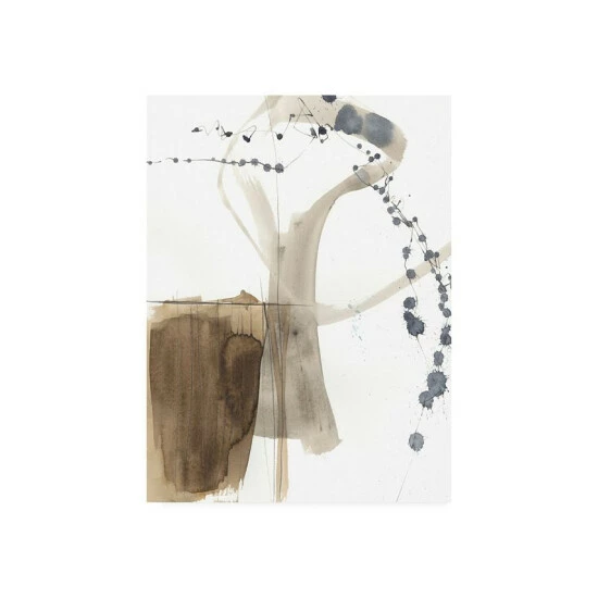 This ready to hang, gallery-wrapped art piece features gray and brown abstract paint over a white background. Gallery-wrap is a method of wrapping an artist’s canvas around a hidden, wooden frame allowing for a frameless presentation.