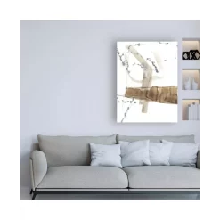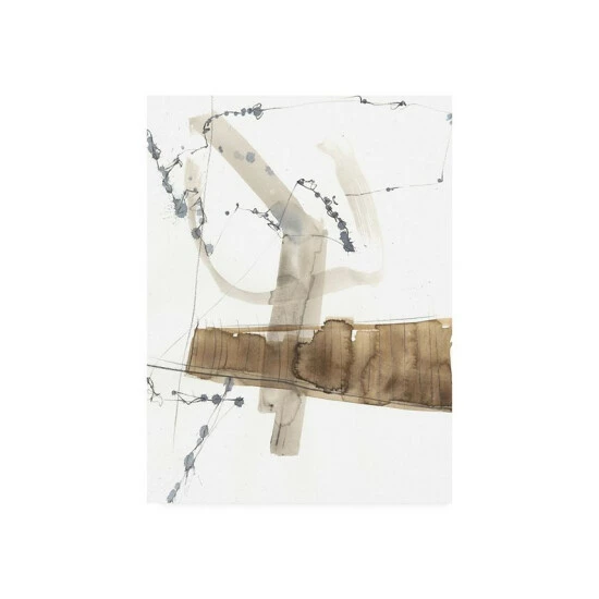 This ready to hang, gallery-wrapped art piece features gray and brown abstract paint over a white background. Gallery-wrap is a method of wrapping an artist’s canvas around a hidden, wooden frame allowing for a frameless presentation.