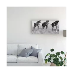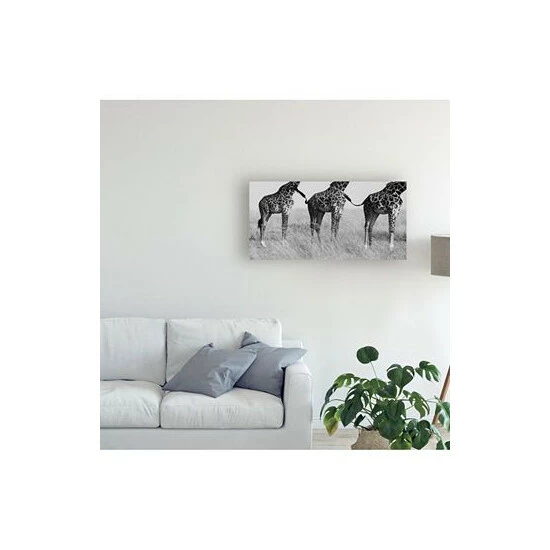This ready to hang, gallery-wrapped art piece features three giraffes standing in a field. Gallery-wrap is a method of wrapping an artist’s canvas around a hidden, wooden frame allowing for a frameless presentation.